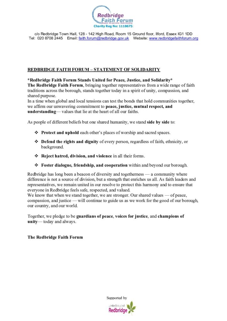 *Redbridge Faith Forum Stands United for Peace, Justice, and Solidarity* The Redbridge Faith Forum, bringing together representatives from a wide range of faith traditions across the borough, stands together today in a spirit of unity, compassion, and shared purpose. In a time when global and local tensions can test the bonds that hold communities together,…
